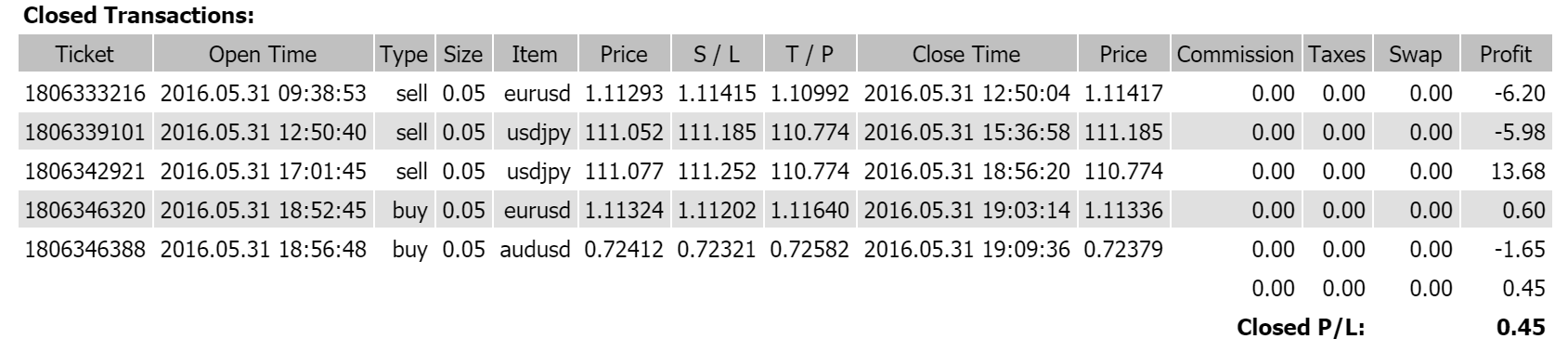 本帖最后由 CXW 于 2016-6-1 11:34 编辑 今天一共进行了5笔交易,三负一胜一平,一天最后结下来不赚也不赔,白忙一天。
